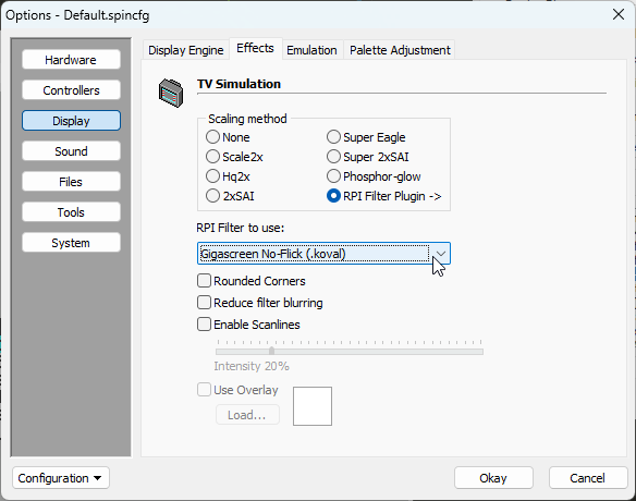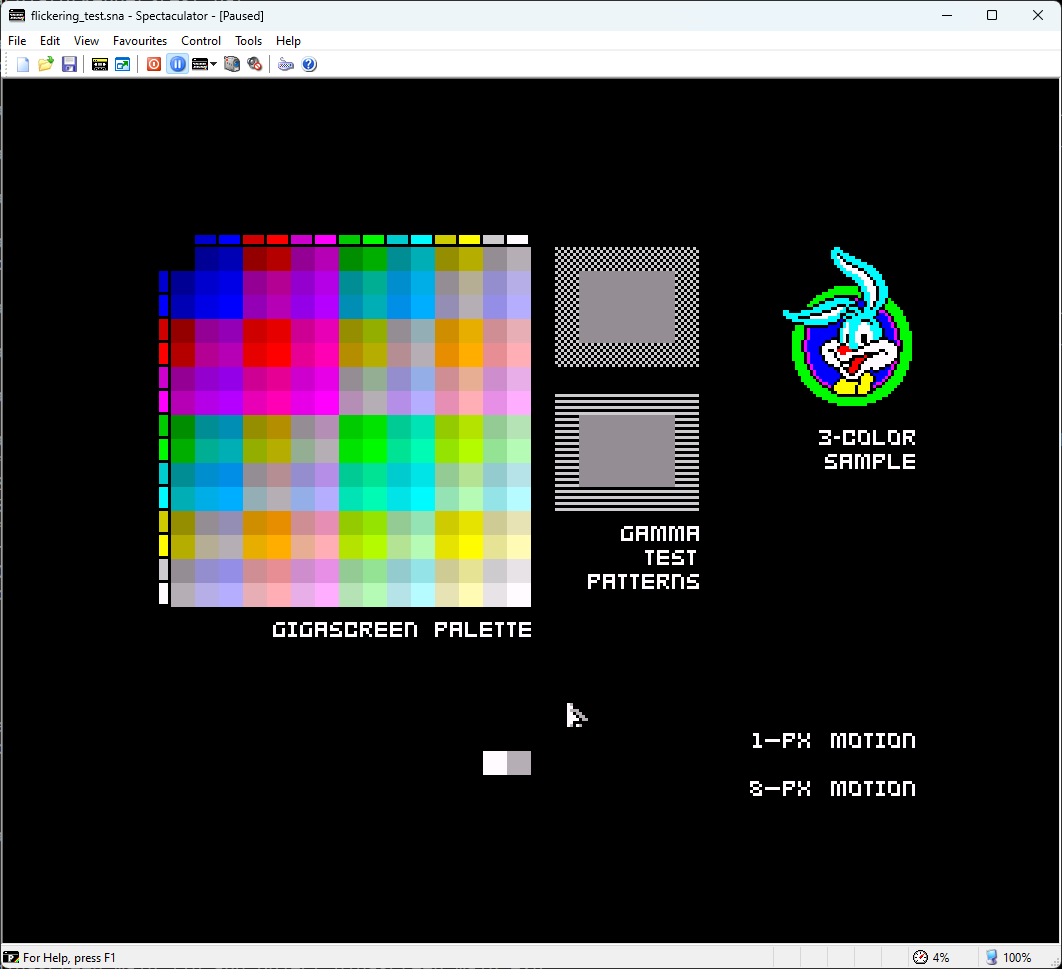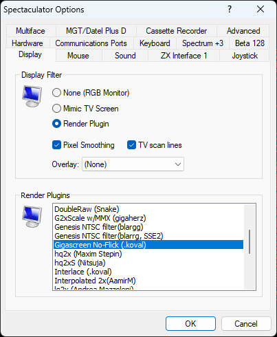 A small render plugin for Spectaculator and ZXSpin (ZX Spectrum emulators) that reduces flicker for Gigascreen and 3Color effects by blending consecutive frames using precomputed lookup tables (LUTs) with Gamma correction applied.